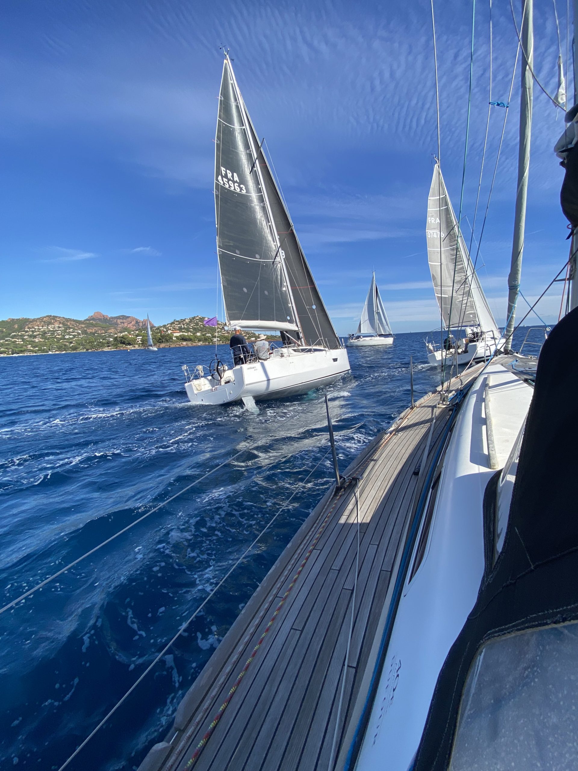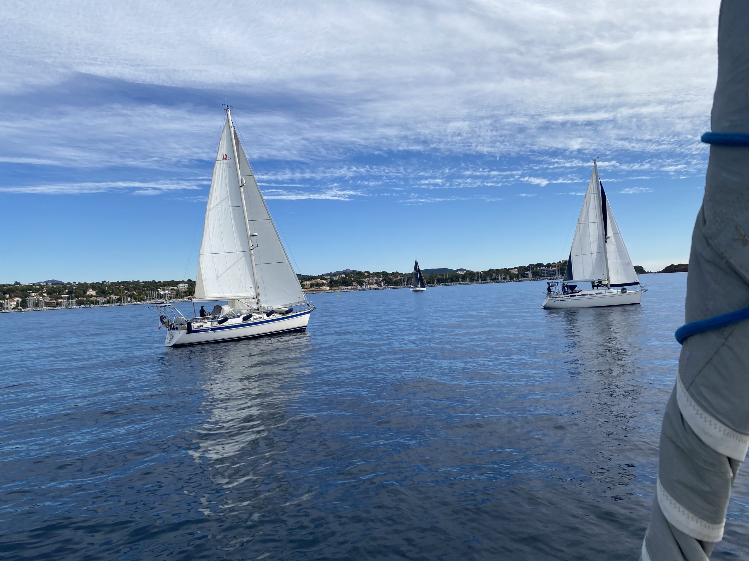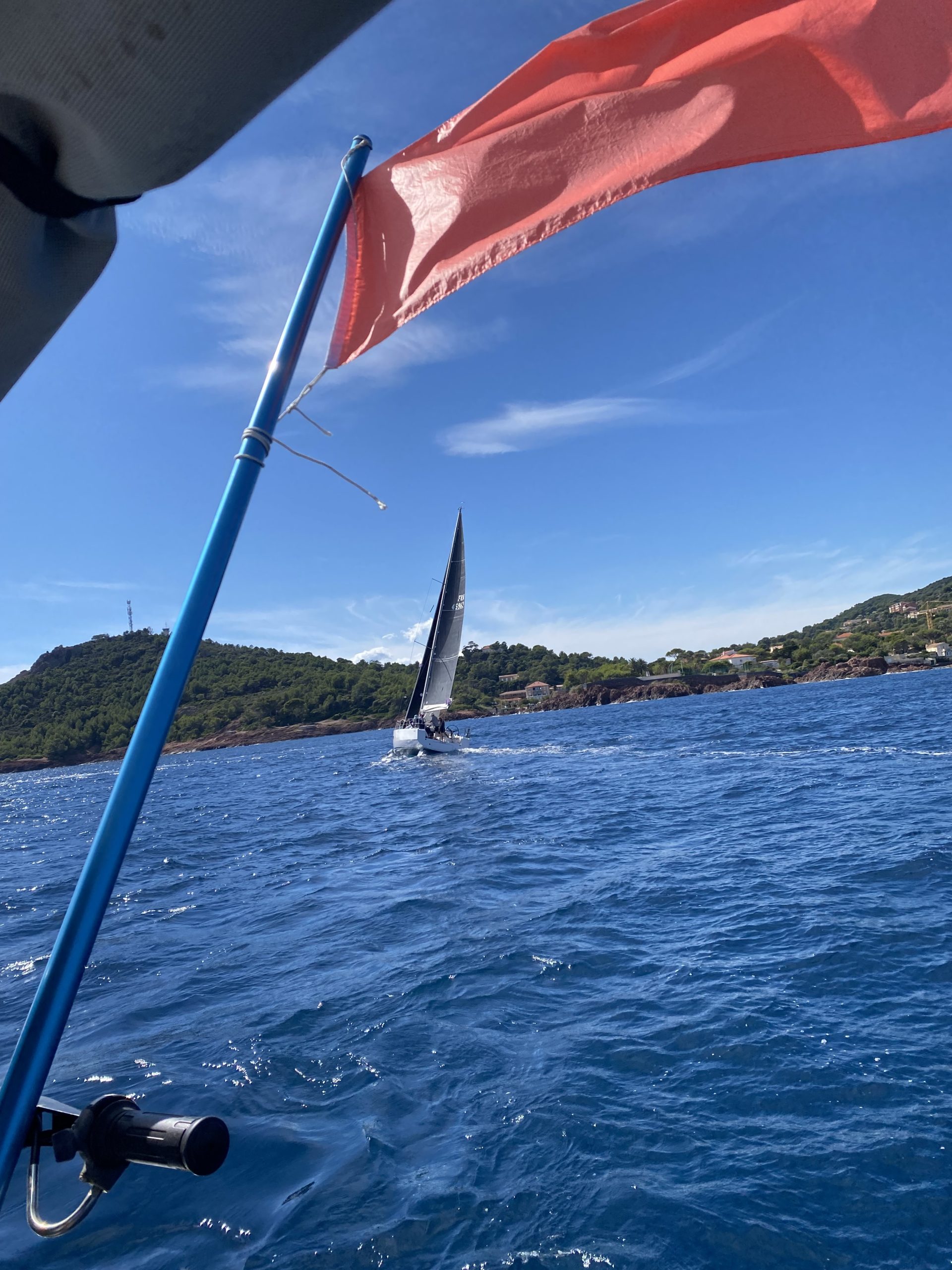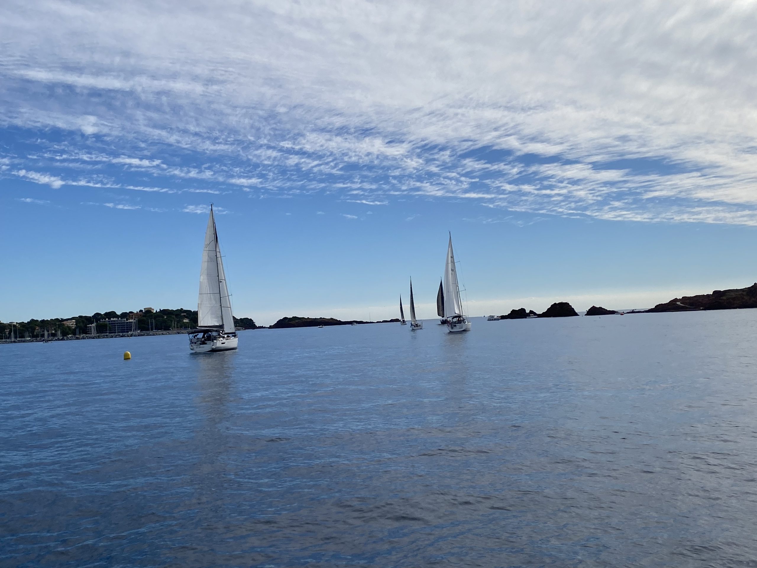Ce ne fut pas le cas cette année. Un très beau temps le samedi pour la régate avec un départ sous « le soleil exactement » mais sans vent. Nous avons renoué avec la tradition du passé puisque nous nous sommes dirigés très tranquillement vers la rade d’Agay où les mouillages nous étaient personnellement réservés. Merci à la capitainerie de la rade pour leur accueil très sympathique. 9 bateaux inscrits, 1 DNS et pour cette première manche seul Pili-Pili est resté sous voiles hautes. Les autres ont dû s’accommoder du moteur pour arriver à l’heure au pique-nique.