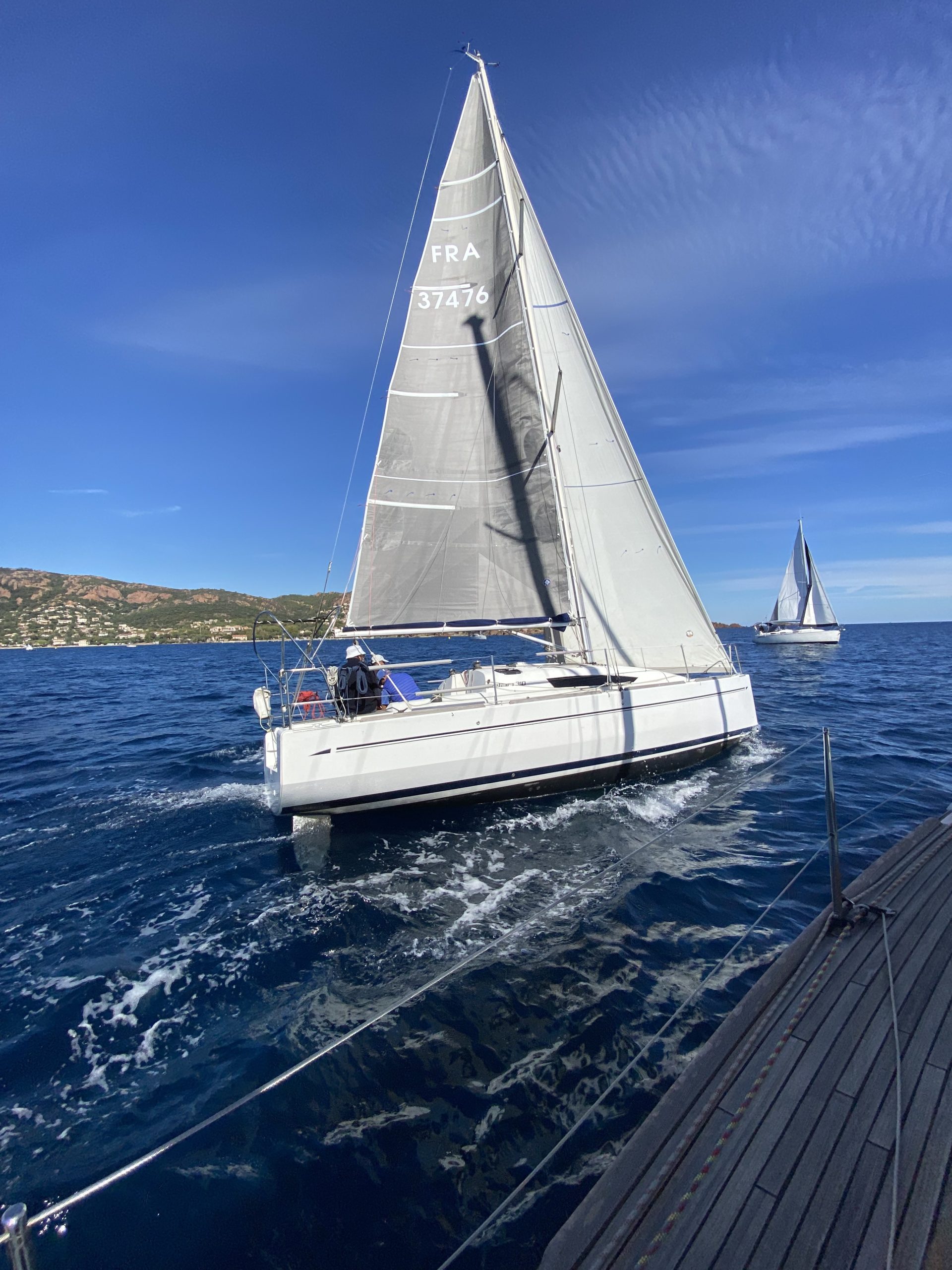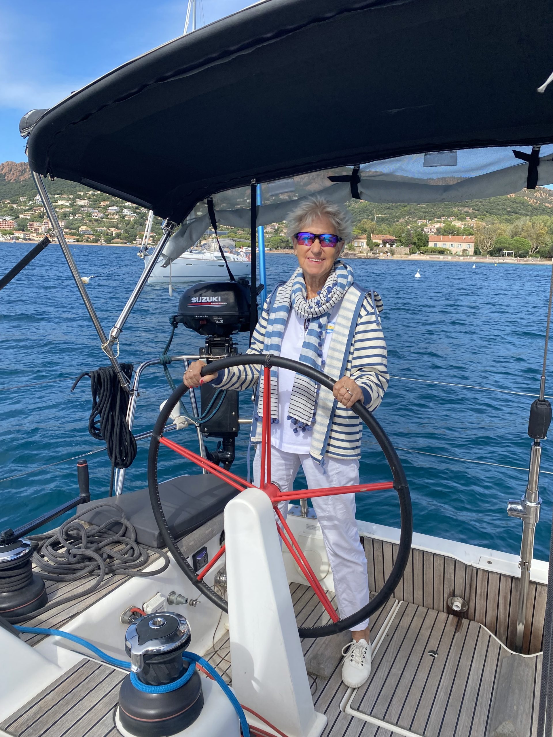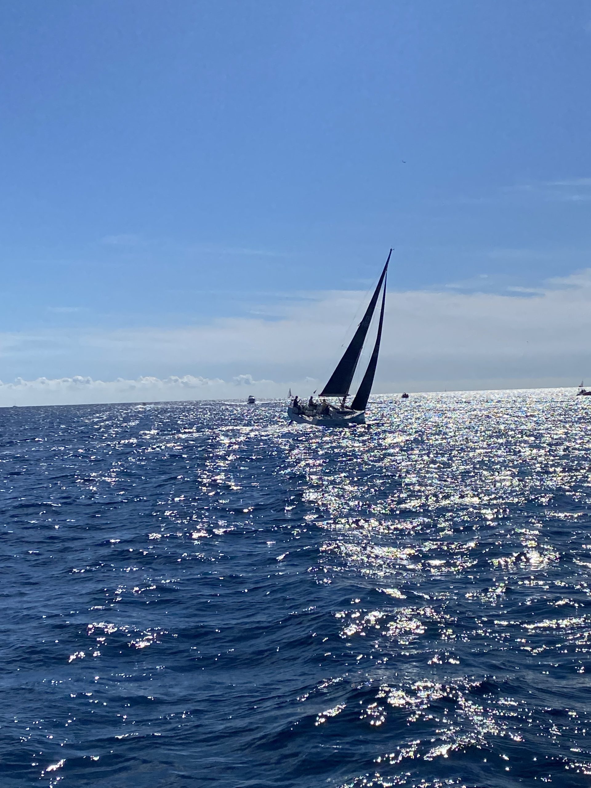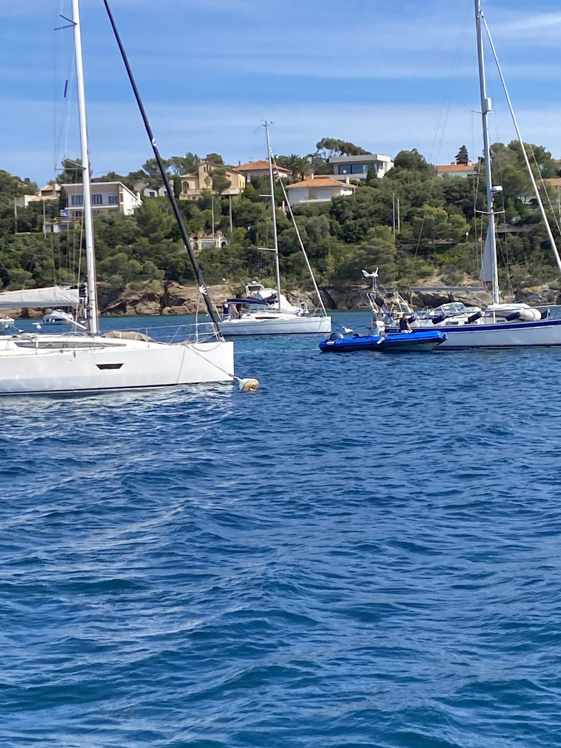Ce ne fut pas le cas cette année. Un très beau temps le samedi pour la régate avec un départ sous « le soleil exactement » mais sans vent. Nous avons renoué avec la tradition du passé puisque nous nous sommes dirigés très tranquillement vers la rade d’Agay où les mouillages nous étaient personnellement réservés. Merci à la capitainerie de la rade pour leur accueil très sympathique. 9 bateaux inscrits, 1 DNS et pour cette première manche seul Pili-Pili est resté sous voiles hautes. Les autres ont dû s’accommoder du moteur pour arriver à l’heure au pique-nique.